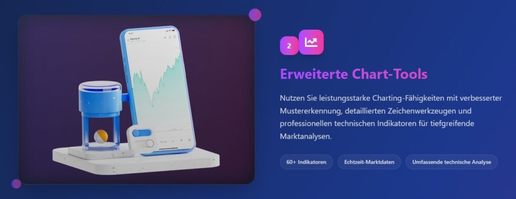 Die Plattform bietet Investoren ein leistungsstarkes Set an Ressourcen, das darauf ausgelegt ist, die Entscheidungsfindung und Portfolio-Performance zu verbessern. Erweiterte Charting-Tools, KI-gestützte Handelsanalysen, Echtzeit-Marktdaten und der Zugang zu einer breiten Palette von Anlageklassen ermöglichen es den Nutzern, fundierte und strategische Investitionsentscheidungen mit Vertrauen zu treffen.